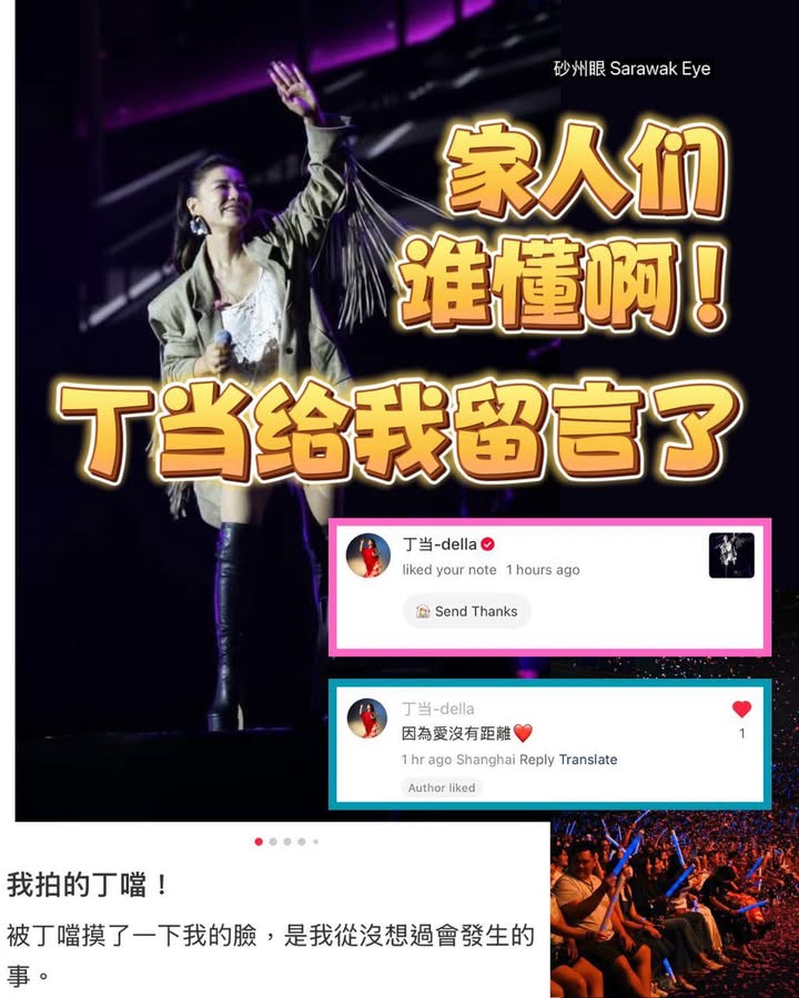 因为每个人看到偶像的反应不同,所以EE在演唱会当场当机,整个人僵硬掉。是的,失魂了。于是她把感受写在小红书,奇迹般的,看到丁噹留言:“因为爱没有距离❤️”