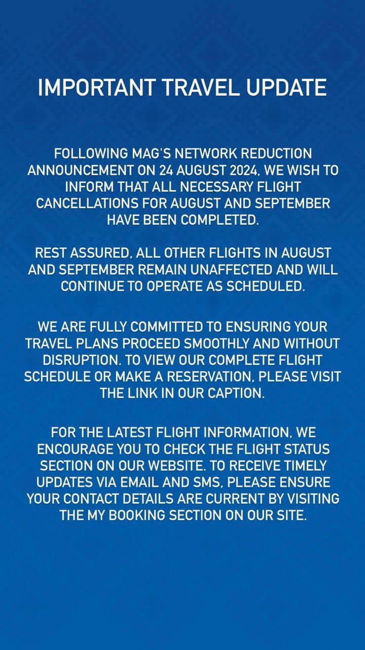 马航今天也发出文告致歉并宣布到12月的班机都会有所调整;不过,一小时前,马航再发出最新文告,表示8月及9月的航班不会受影响,继续飞行计划。