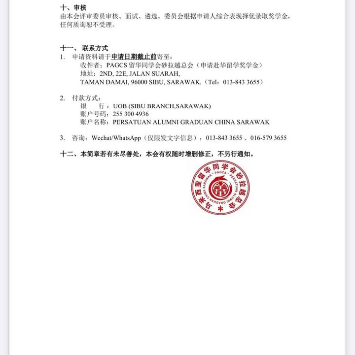 中国驻古晋总领事馆拨款15万令吉,资助砂拉越14所独中的学生前往中国深造,还有机会到北大念书。