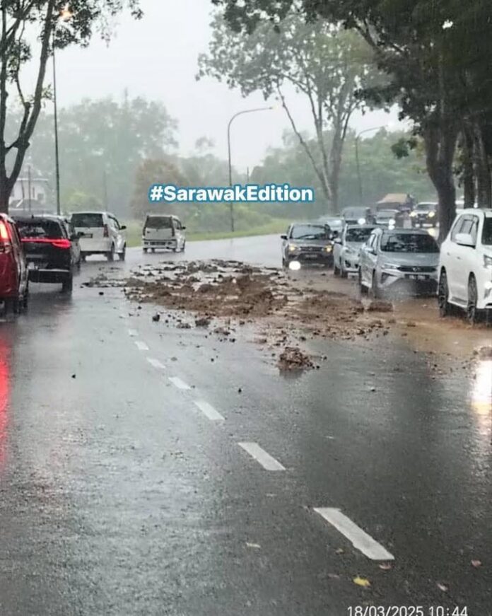 应该是大型罗里掉落的沙石造成,古晋二小前的路段在雨中成了泥泞路。有经过的司机们注意注意,弄脏车还是小事,尤其对摩托车就有点危险了,经过的轿车也要放慢车速。