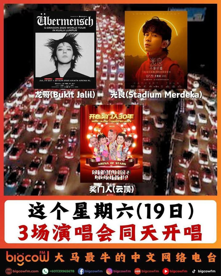 今天是个超级星期六,西马半岛有三场演唱会同一天在今晚进行,包括当兵退伍后进行王者归来举办世界巡回演唱会的G Dragon,光良的演唱会,以及开心奖门人30年的的演唱会。