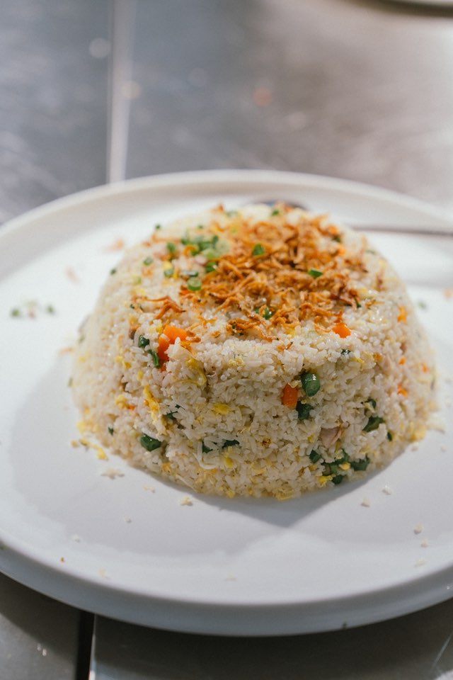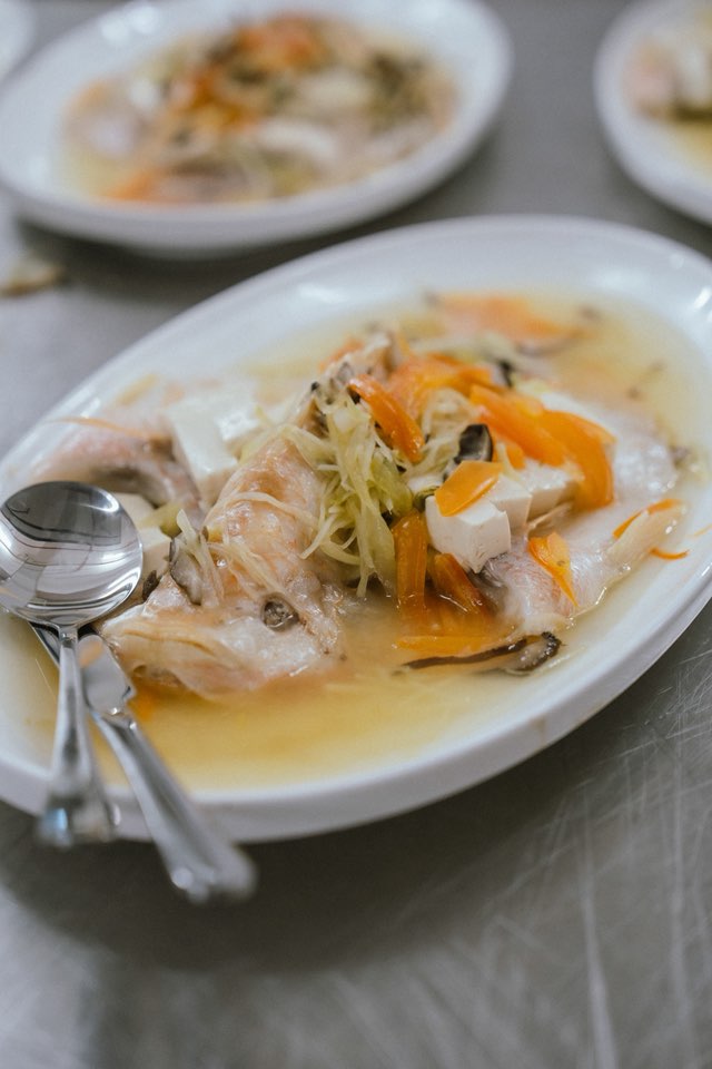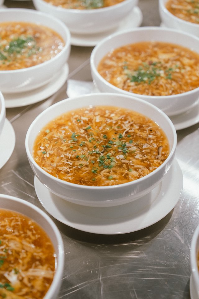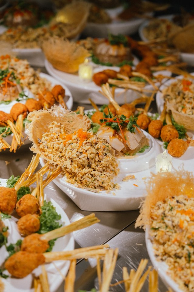 第一道菜一般上都是冷盘(蟹肉桂花翅、香茅鸡和海蜇)、鱼漂羹、烧鸡、潮州鱼、咸酥虾、豆干蘑菇西兰花、黄金炒饭以及潮州汤圆。