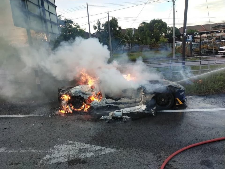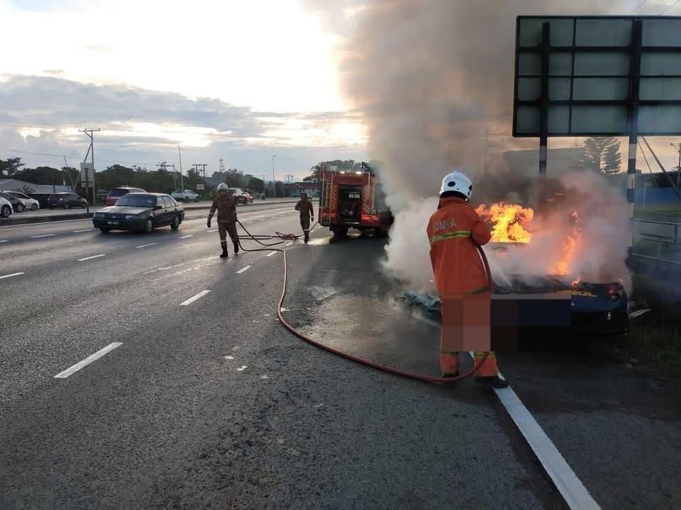 今天接近傍晚6点左右,位于古晋——西连12哩靠近红绿灯的路段附近,发生跑车起火事件。