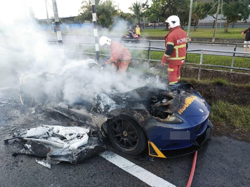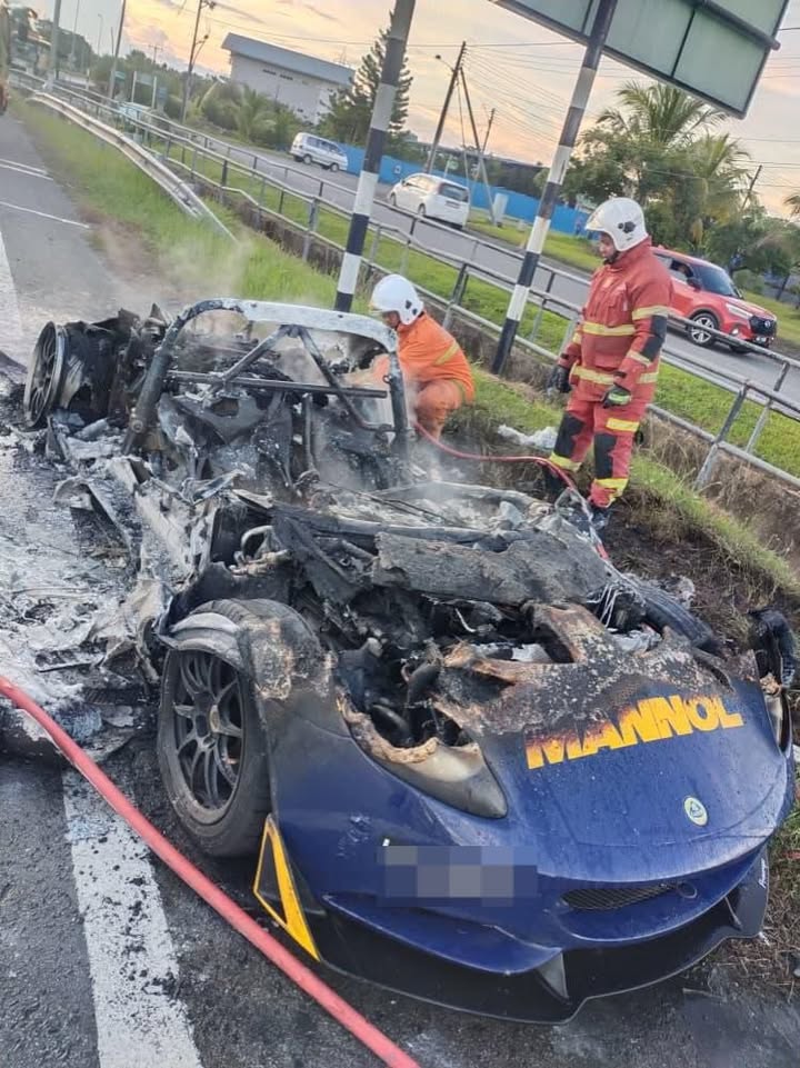 消拯队员来到现场,拉起水管灭火。不过等火势完全熄灭,这辆英国制造的Lotus Elise跑车也已经完全烧毁了。