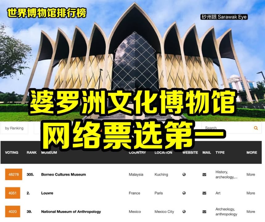 全球有知名度的《世界博物馆排行榜》,婆罗洲文物馆Borneo Culture Museum排在第305的位置,但如果只看网络投票,是全球入选的413间博物馆当中,票数最高的!
