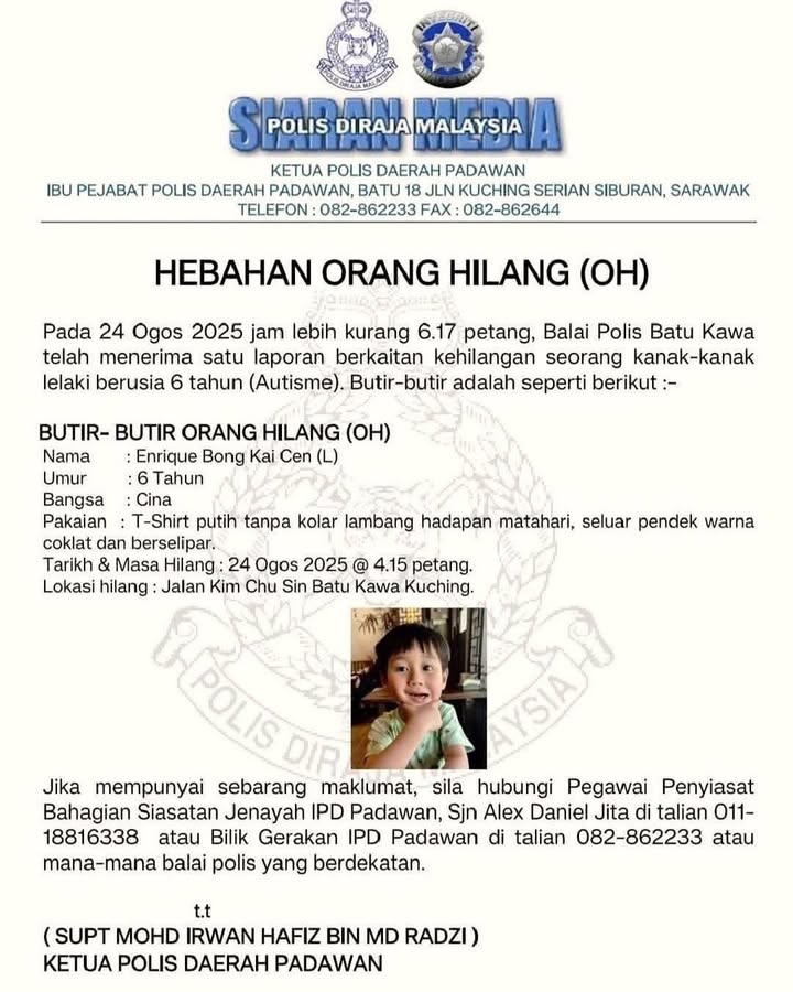 他名叫Enrique Bong Kai Cen,今年6岁,昨天下午在家人不知情下出走,住家位于Batu Kawa Jalan Kim Chu Hin金珠盛一带。