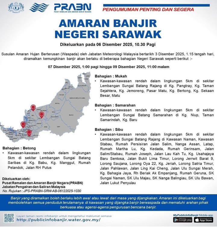 国家水灾预测及警报中心(PRABN)也发出警告,一直到12月9日,木中、沐胶、三马拉汉和诗巫的低洼地区都有淹水的风险。
