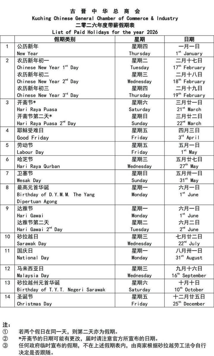Home新闻快报古晋中华总商会公布2026年带薪假期 新闻快报 古晋中华总商会公布2026年带薪假期 By sarawakeyeadmin December 8, 2025 0 16 Share FacebookTwitterPinterestWhatsApp 古晋中华总商会公布2026年带薪假期,共有18天。努力工作,然后努力的玩。可以安排明年的计划了! View on Facebook Share FacebookTwitterPinterestWhatsApp Previous article又到年底 sarawakeyeadminhttps://sarawakeye.my 相关文章 新闻快报 又到年底 December 8, 2025 新闻快报 圣诞节的季节 December 7, 2025 新闻快报 政府“新”宣布 December 7, 2025 - Advertisment - 最受欢迎 又到年底 December 8, 2025 圣诞节的季节 December 7, 2025 政府“新”宣布 December 7, 2025 进入12月也开始倒数圣诞节 December 6, 2025 Load more