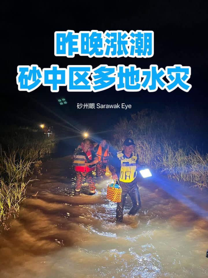 因为大涨潮,加上这几天都一直下雨,中区几个地方昨晚起水位急速上升,路面被江水覆盖。消防队民防部队都忙坏了。