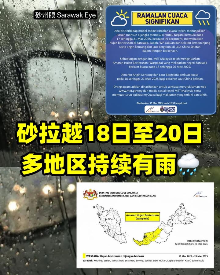 由大马气象局发出的天气预报,由于季候风关系,南中国海海域将从3月18日起至21日面对强风大浪,造成沙巴、砂拉越和西马南部持续下雨。