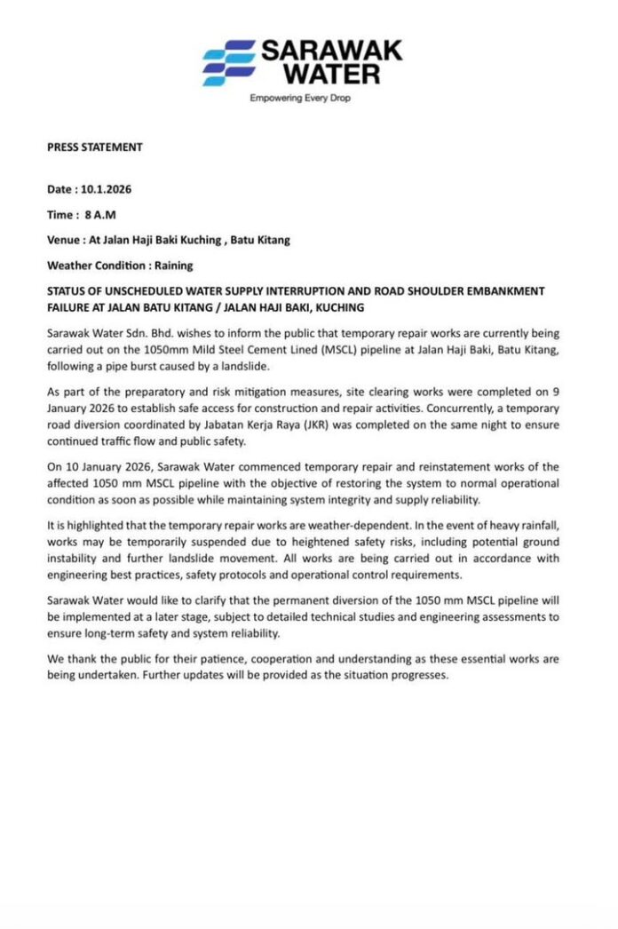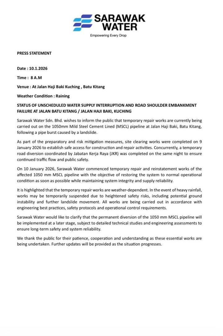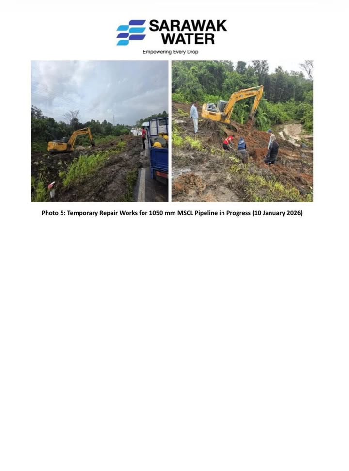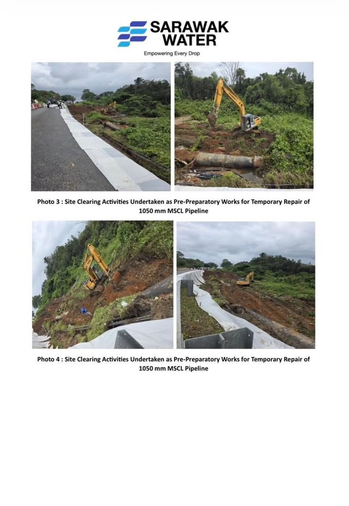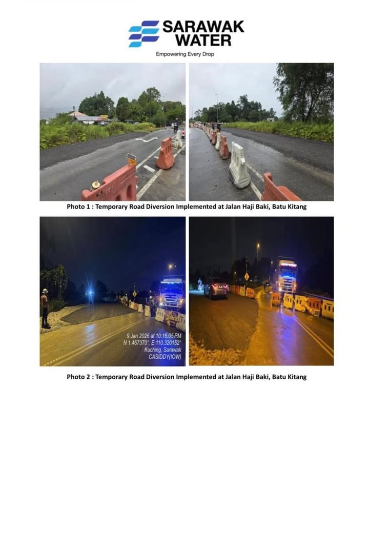 在Sarawak Water有限公司和公共工程局JKR配合下,事发地点完成临时道路改道工程,让交通可以保持通顺。