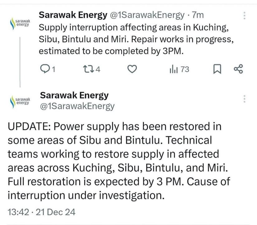 Home新闻快报听到欢呼声 新闻快报 听到欢呼声 By sarawakeyeadmin December 21, 2024 0 5 Share FacebookTwitterPinterestWhatsApp 听到欢呼声,原来是“来电“了。 很多地区已陆续恢复电源。这是属于大规模的停电,停电影响地区不止古晋,还包括民都鲁、诗巫和美里,预料最快下午3点才能恢复。 View on Facebook Share FacebookTwitterPinterestWhatsApp Previous article古晋这个时候大停电! 你们哪里有电吗? 受影响地区:PadunganNext article经历了大停电 sarawakeyeadminhttps://sarawakeye.my 相关文章 新闻快报 天佑美里 December 9, 2025 新闻快报 古晋中华总商会公布2026年带薪假期 December 8, 2025 新闻快报 又到年底 December 8, 2025 - Advertisment - 最受欢迎 天佑美里 December 9, 2025 古晋中华总商会公布2026年带薪假期 December 8, 2025 又到年底 December 8, 2025 圣诞节的季节 December 7, 2025 Load more