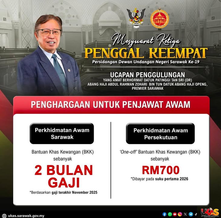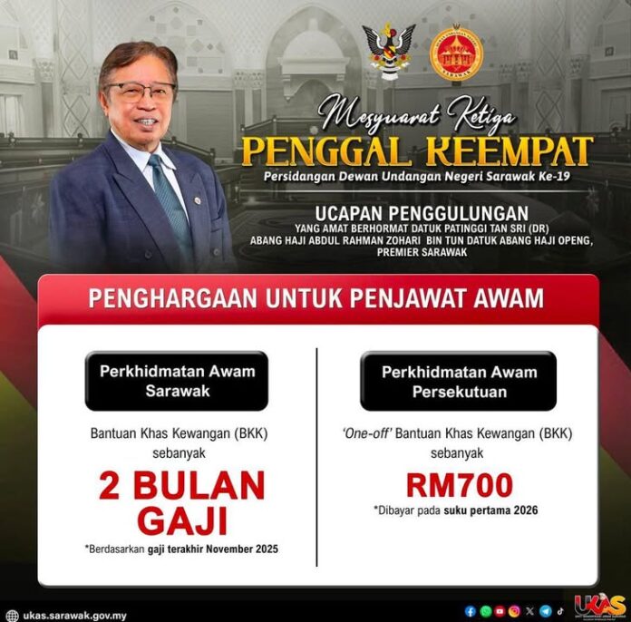 阿邦佐将发放两个月的Bonus基本薪资给公务员;同时也造福在砂拉越服务的联邦公务员,他们将获得一次性RM700的特别援助金。