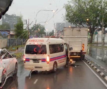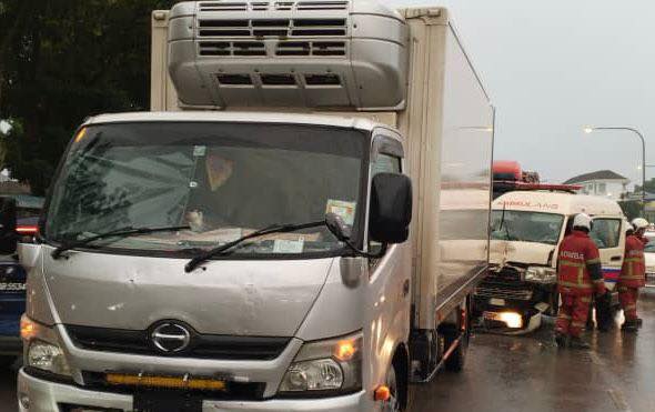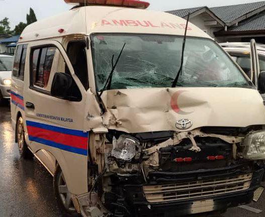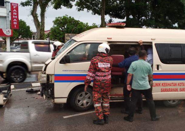 车祸傍晚6点半左右发生在Tabuan Jaya一带,卫生部的救护车与3吨重的罗里发生碰撞。救护车司机腿部被夹伤,在消拯队员抵达之前已由民众救出。