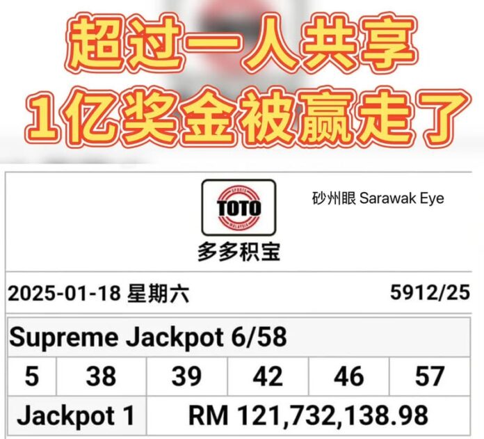 号码是5、38、39、42、46、57。你们中几粒字?今天全马太high,累积奖金已经达到1亿2173万2138令吉98仙。