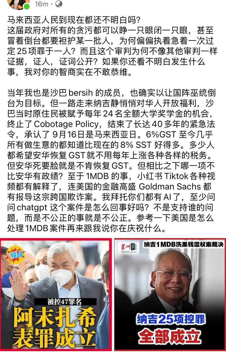 我们可以批评他的罪行,但也不要全面否认他的治理能力。加油马来西亚。