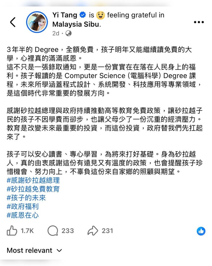 已经有砂拉越的孩子收到大学免费学科的录取通知书了🥰