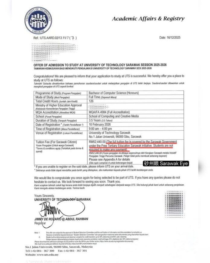 这是来自Sibu一名家长的分享,她的孩子将到UTS深造,3年半的学费全免。