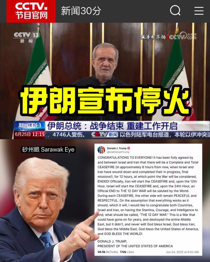 昨天,美国总统特朗普在社交媒体Truth Social发文表示“以色列和伊朗同意全面彻底停火”,会先由伊朗停火,之后的12个小时轮到以色列启动停火。