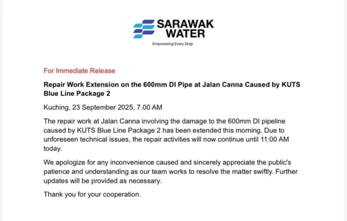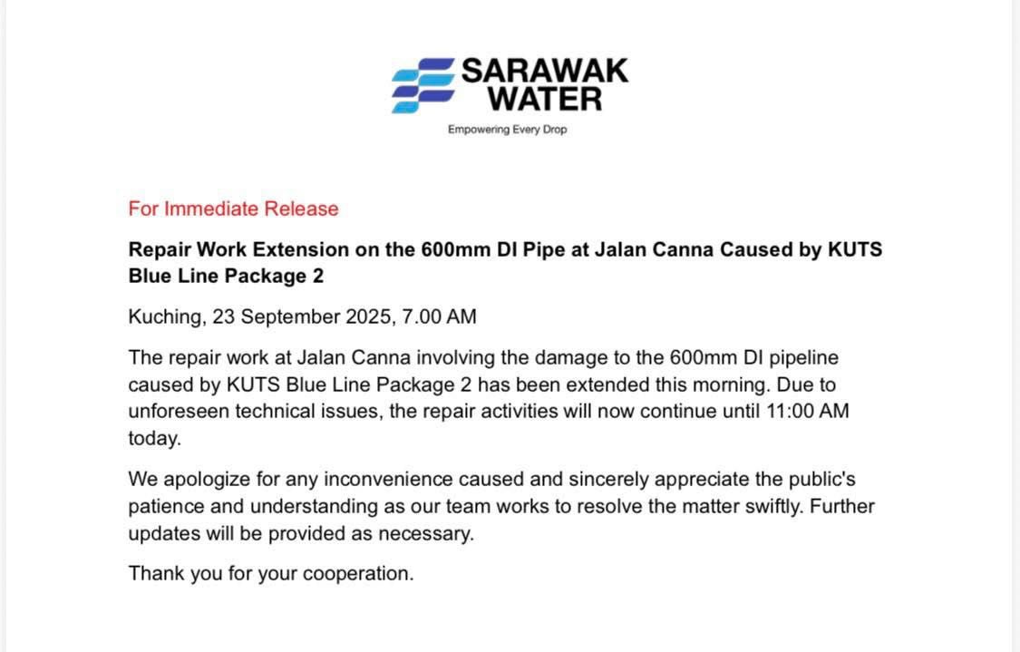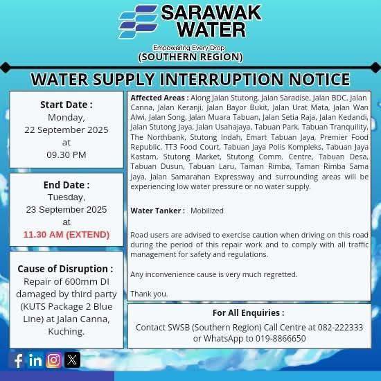 Home新闻快报抢修工程未完成 新闻快报 抢修工程未完成 By sarawakeyeadmin September 23, 2025 0 7 Share FacebookTwitterPinterestWhatsApp 抢修工程未完成,一些人家里还是没水。😪 砂水务公司通知,因技术性问题,延迟到今早11点半才有水。 Jalan Canna一条直径600毫米的水管,昨天因交通系统工程受损破裂,导致部分地区出现水供问题。 View on Facebook Share FacebookTwitterPinterestWhatsApp Previous article你们的地区有断水、水压低问题吗? Jalan Canna一条直径600毫米的水管Next article昨天破裂的大水管还没修好 sarawakeyeadminhttps://sarawakeye.my 相关文章 新闻快报 沙巴的大选才刚刚结束 December 5, 2025 新闻快报 新加坡总理黄循财宣布 December 4, 2025 新闻快报 哇 December 3, 2025 - Advertisment - 最受欢迎 沙巴的大选才刚刚结束 December 5, 2025 新加坡总理黄循财宣布 December 4, 2025 哇 December 3, 2025 AirBorneo婆罗洲航空正式明年1月启航 December 2, 2025 Load more