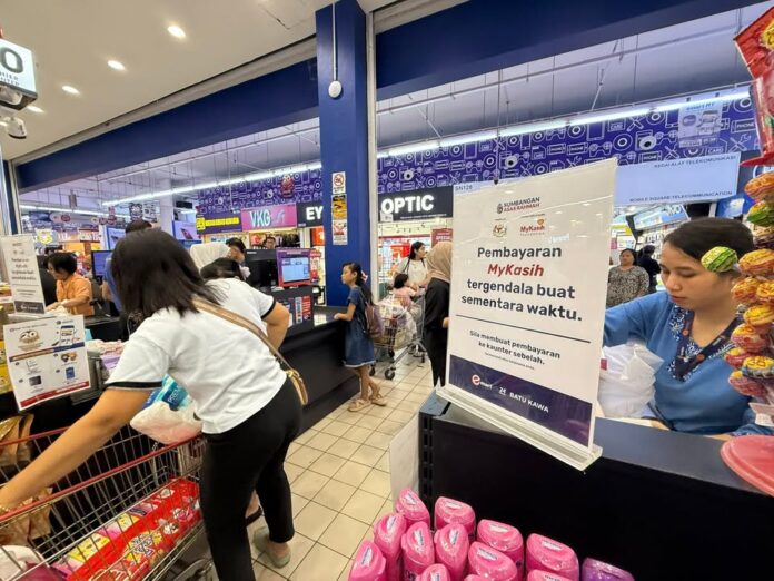 政府国庆日发放的100令吉爱心援助金(SARA)今天还是系统大当机,很多人选了日常用品来到付款柜台看到通告,就把推车弃在一旁失望离开。