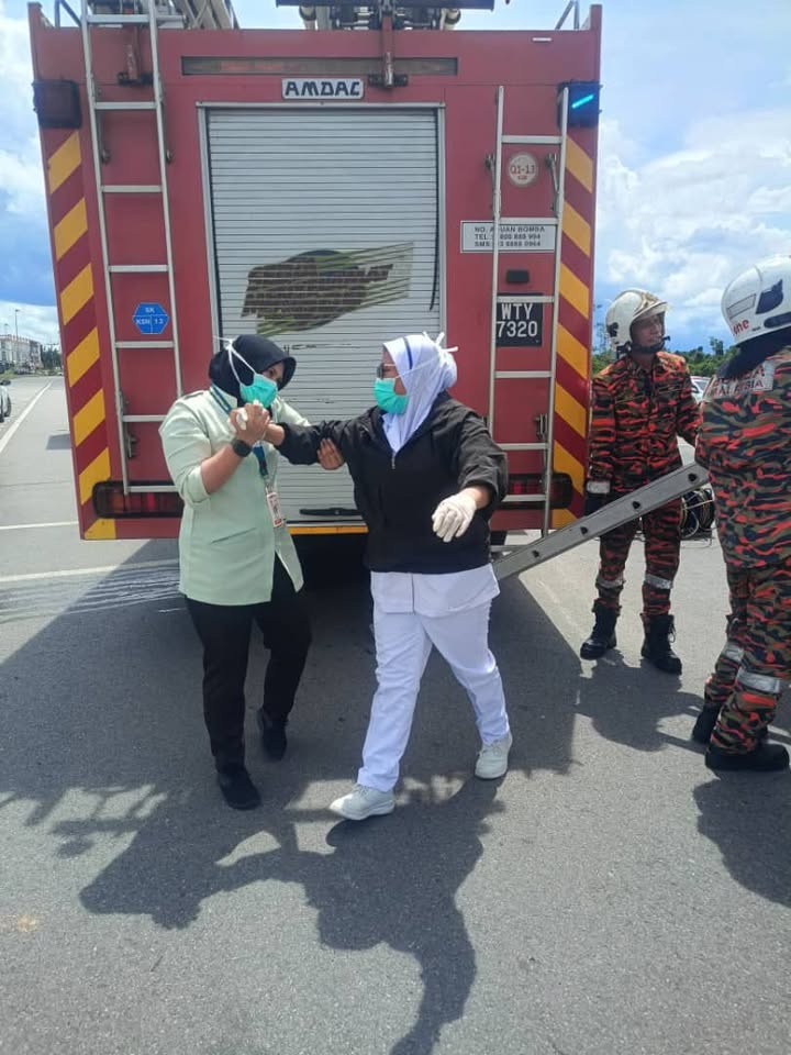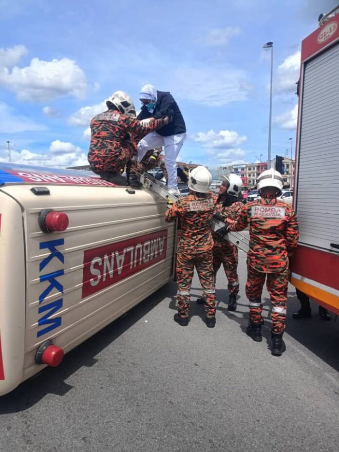 隶属砂中央医院的救护车在前往载送病人的途中,在三马拉汉土地复兴局大厦附近的红绿灯前发生车祸,救护车侧翻在路上。