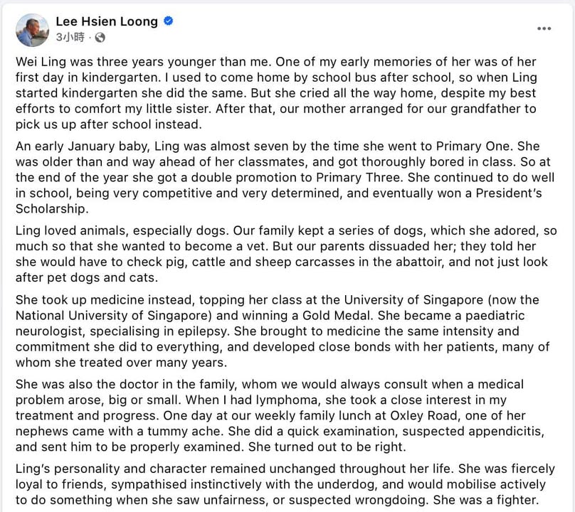 李显龙发长文悼念妹妹,当中表示妹妹是一名成绩优异、公义的斗士,喜欢小动物。小时候想当兽医的她,被爸妈劝退后最终成为了儿科神经医生。当初李显龙换上淋巴癌,妹妹也时刻关注她的病情。