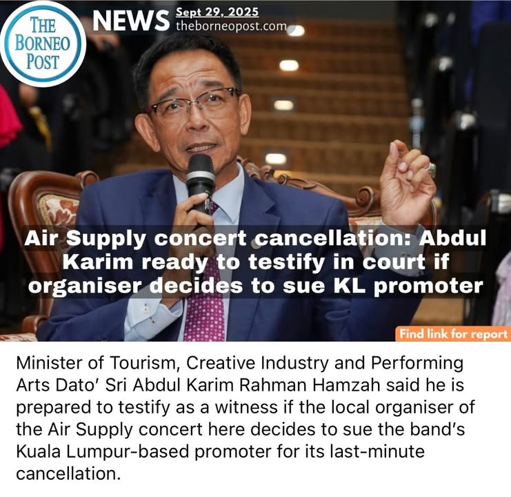 砂拉越难得迎来国际演唱会,原订9月24日举行的Air Supply 50周年古晋演唱会,在演出当天凌晨临时喊停,让远道而来的粉丝措手不及,引发大众的错愕与不满。