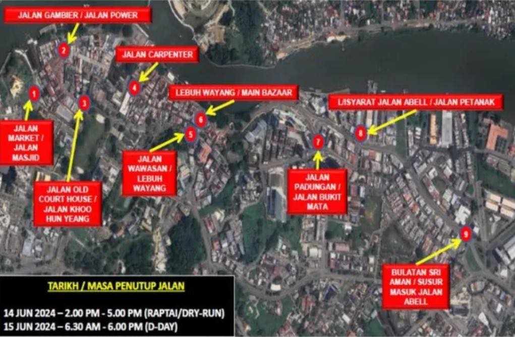 明天部分路段进行封路。Waterfront的舞台已经搭建好,今年会有99支队伍和13辆花车登场,也可以看到沙巴Kadazan Dusun代表参加。