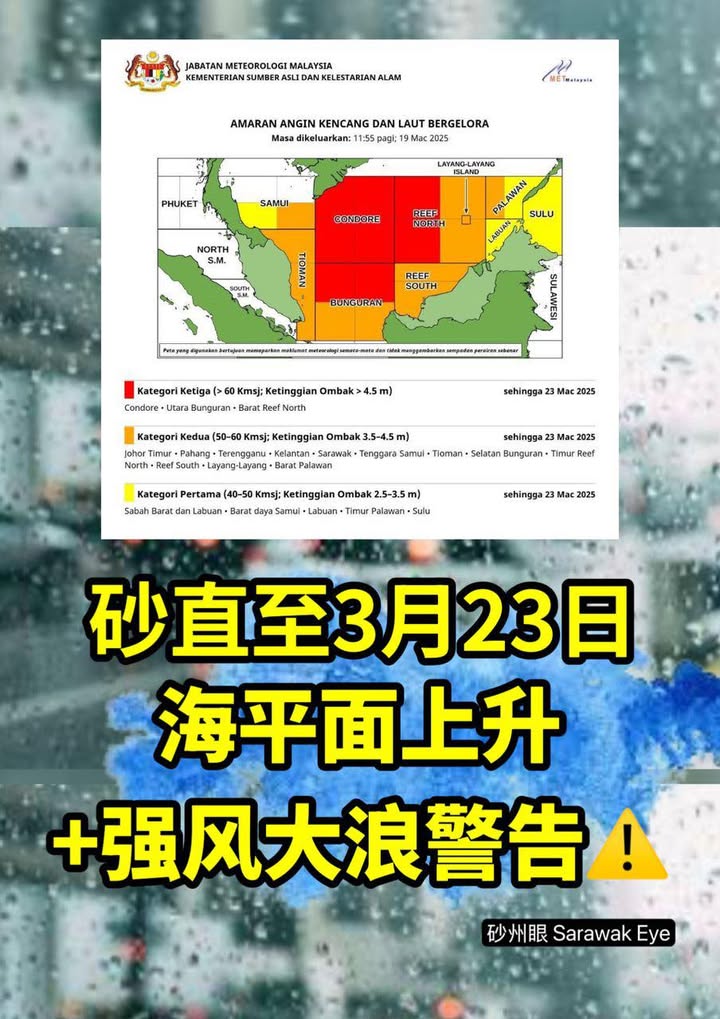 另外,直到3月21日(星期五),砂拉越海域的水平面也会明显上升,出海活动面对一定风险。