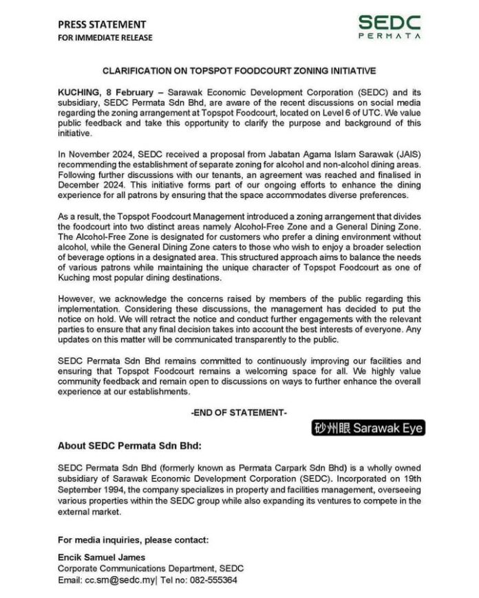 针对Topspot美食中心分为饮酒区和非饮酒区后撤下的SOP,砂经济发展公司(SEDC)回应,的确是收到来自JAIS(砂拉越伊斯兰事务局)的提案。