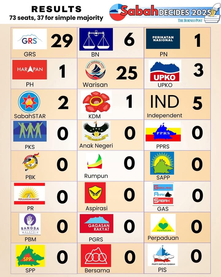 沙巴成绩凌晨2am 才出炉,GRS 沙盟掌握29席,Warisan民兴党也赢了25席,两个阵营实力相当!