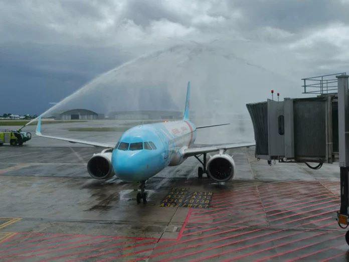 昨天深圳直飞古晋的首航抵达古晋,受到洒水仪式欢迎,中国驻古晋总领事邢伟平也在场迎接。