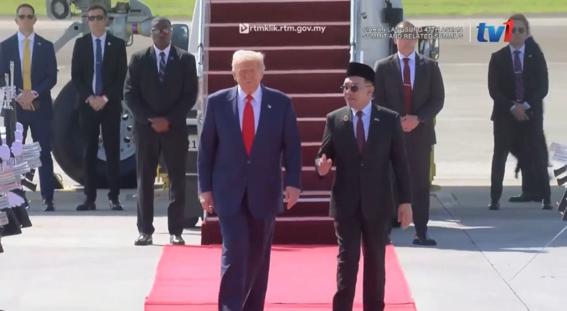 飞机比预计的10点15分更早就降落在吉隆坡国际机场。在出发前,一早美国总统特朗普就发文表示,自己一抵达马来西亚,就会签署柬埔寨与泰国之间的和平协议。