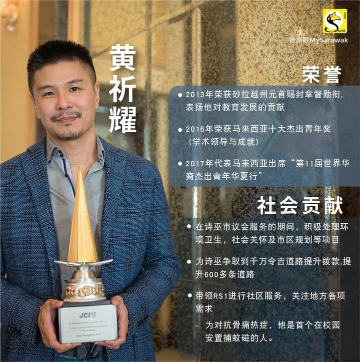 当年,连Taib Mahmud都赞扬他对砂拉越高等教育作出的贡献,说在短时间内为诗巫创立3个学院,连他也做不到,所以册封黄祈耀为Dato。