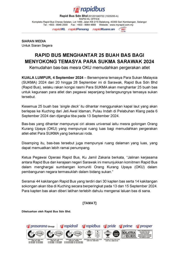 Rapid KL官方也在今天宣布,会将25辆特殊巴士海运来古晋,用来载送残疾运动员,尤其是使用轮椅者。