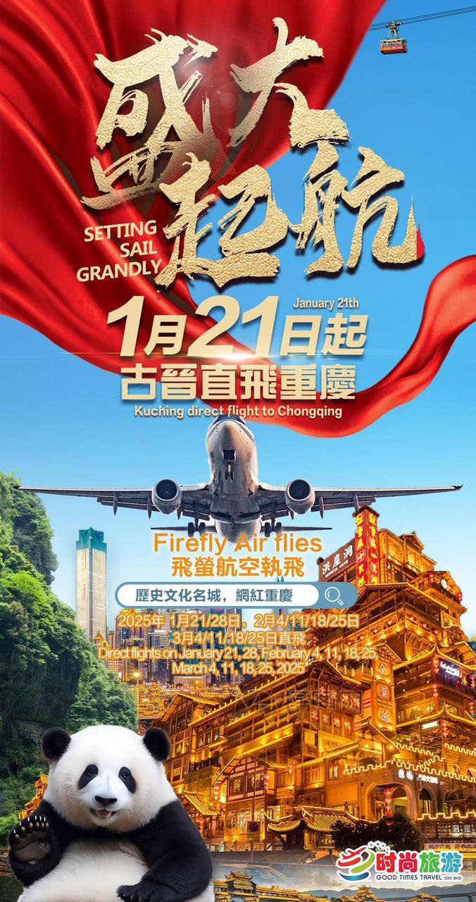 根据时尚旅游提供的照片显示,2025年1月21日起Firefly飞萤航空将开启古晋直飞重庆的班机,日期包括1月21日、28日;2月4日、11日、18日、25日;以及3月4日、11日、18日、25日。