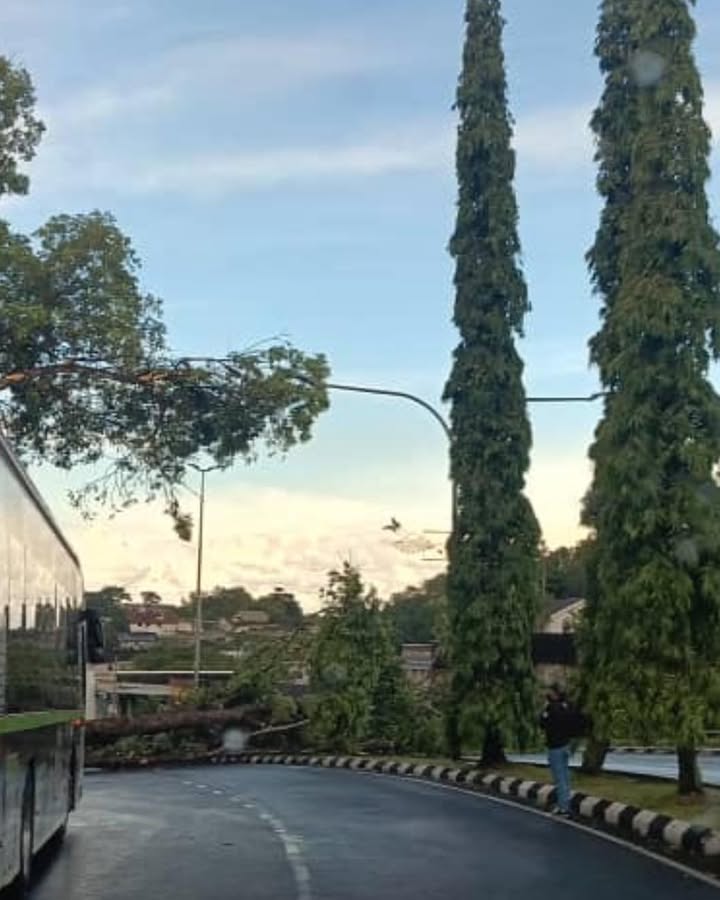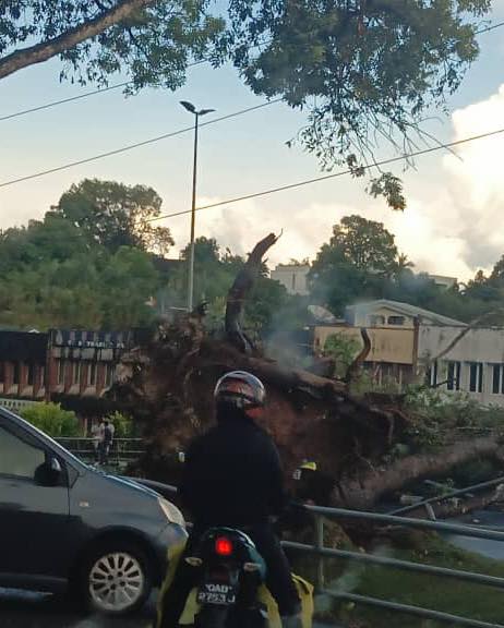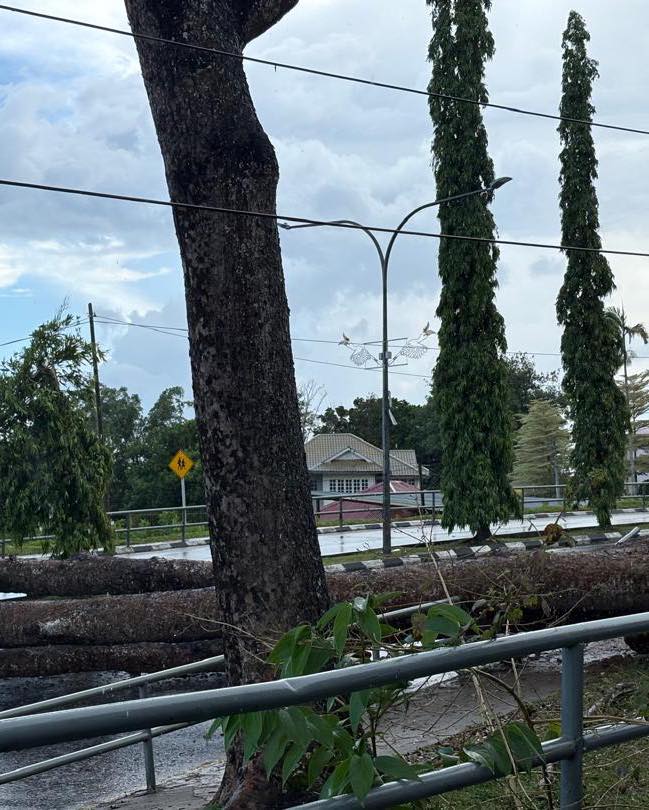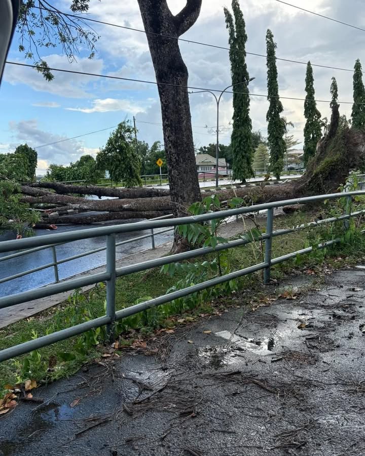 真的是吓死宝宝了,古晋一中前面的大树倒下,现在交通也严重瘫痪。