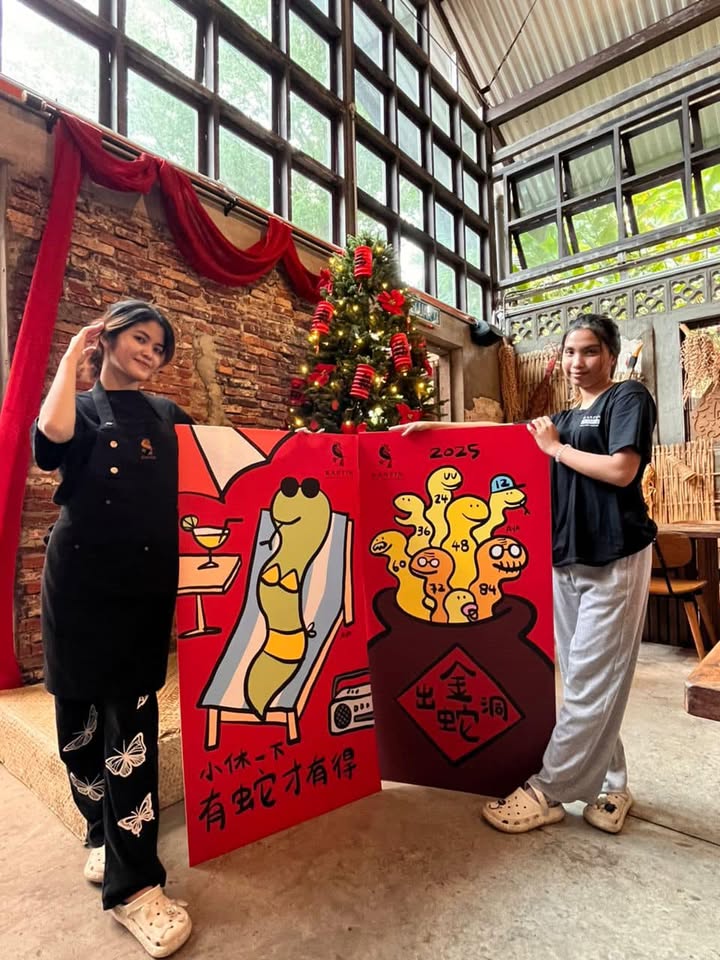 这次一样,有青蛇系列红包,还有大看板,有经典的传统Acar、有新年Tuak还有好吃到你心趴的年菜啊,给大家拍照,沾一沾喜气福气。上天啊,2025年请多多关照,不要飞来横祸啊🙏🏼