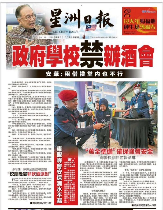 首相安华昨天表示,酒精不能进入校园,即使是非校方单位举行的活动,租借学校的地方办宴会活动,也不可以供酒。