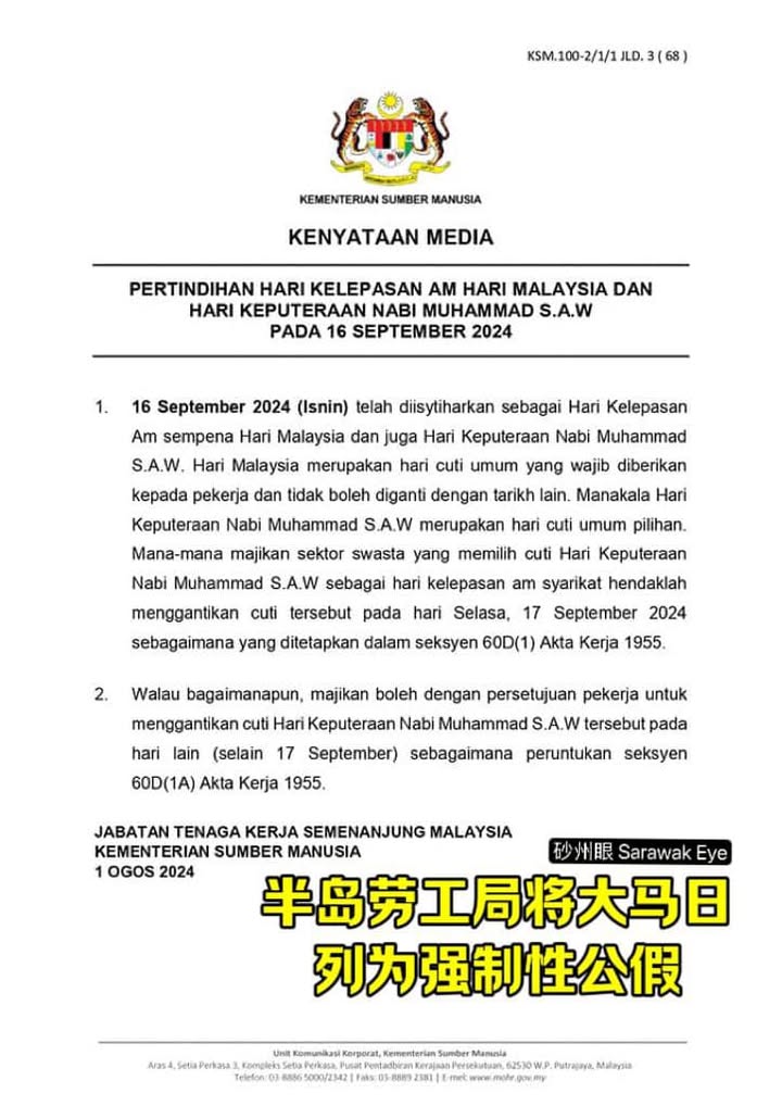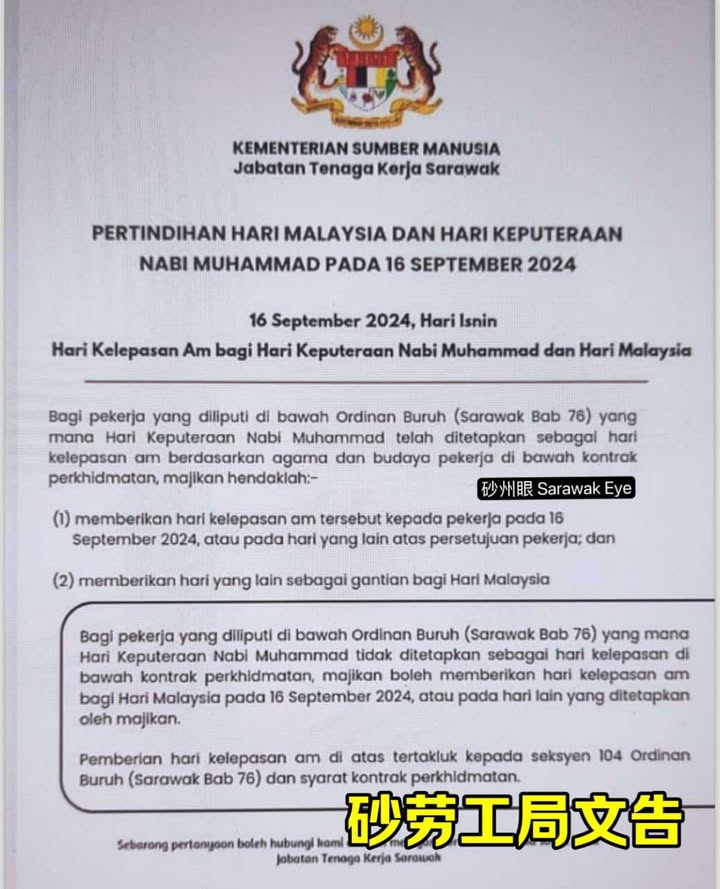 所以,私企就要看你的公司是不是有把默罕默德诞辰这一天列为公共假期了。基本上砂拉越的私人公司都是依据砂中华总商会的时间表来放假。根据2024年的带薪假期列表,商会是将9月16日定为大马日公共假期,而先知默罕默德则不是假期。