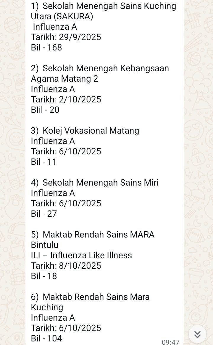 其中记录最多病例的是古晋的Sekolah Menengah Sains Kuching Utara和Maktab Rendah Sains Mara Kuching,分别有超过100宗病例。