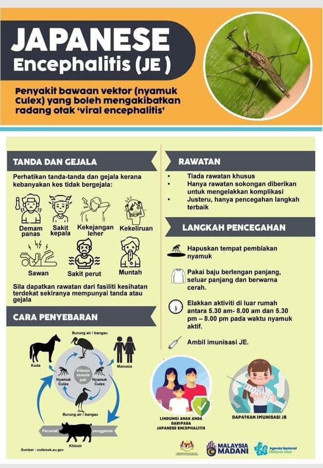 沐胶卫生局发出文告表示,从12月4日的报告发现一宗人类确诊日本脑炎的病例后,当局展开行动,为附近2公里半斤范围内15岁以及以下年龄未打针的少年儿童注射疫苗。