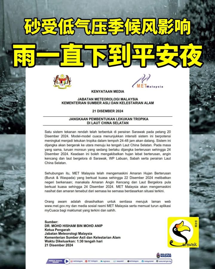 同时,在南中国海的季候风也预计持续到12月24日,也即是圣诞夜前夕的平安夜。在这样的情况下,砂拉越、沙巴和纳闽都可能出现持续性的暴雨和强风大浪。