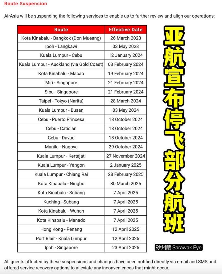亚航AirAsia宣布近期会关闭的直飞航线,也列出最近这几年停航的班机,包括诗巫和美里飞新加坡。