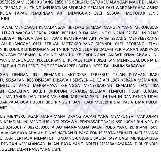 车主被警方援引1987年陆路交通法令》第 41(1) 条文(危险驾驶导致死亡)进行调查。