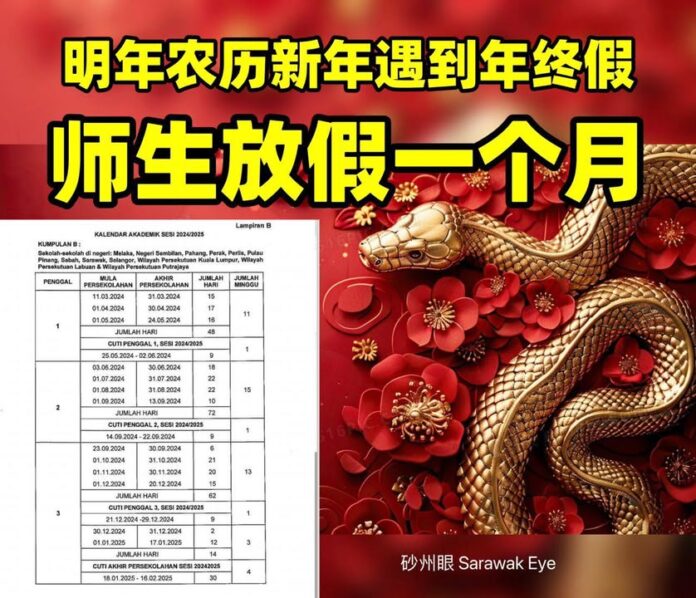 现在学校学年还没有调整回1月开始新学年,所以2024学年的最后一个年终假期会落在1月18日至2月16日(B组学校包括砂拉越);而明年的农历新年落在1月底。