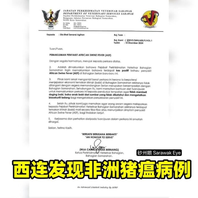 西连发现一宗非洲猪瘟阳性病例,砂兽医局日前发文正式宣布此事。