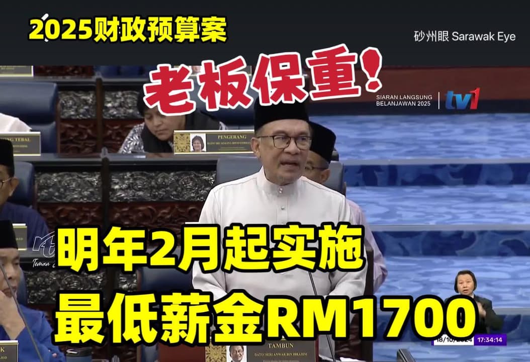 首相兼财长安华宣布,2025年2月1日起,全国最低薪金从RM1500增加至RM1700。