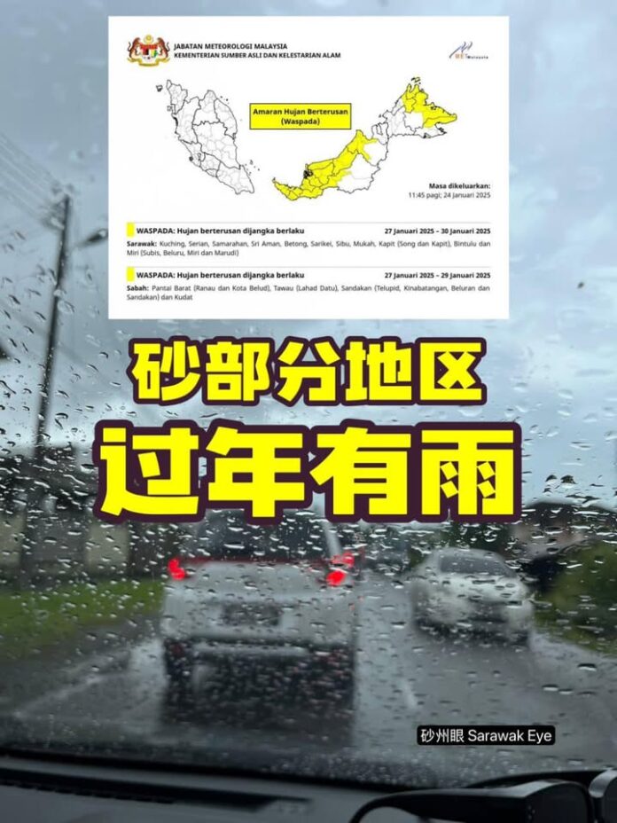 Home新闻快报过年……应该是下雨的节奏了 新闻快报 过年……应该是下雨的节奏了 By sarawakeyeadmin January 26, 2025 0 21 Share FacebookTwitterPinterestWhatsApp 过年……应该是下雨的节奏了。 大马气象局的预测,下个星期一到星期四(27/01-30/01),砂沙好几个地区将连续下雨。 包括古晋、西连、三马拉汉、泗里街、木中、加帛、民都鲁、美里好几个地区。 View on Facebook Share FacebookTwitterPinterestWhatsApp Previous article古晋很塞车了!倒数几天就过年了Next article新年前的悲剧 sarawakeyeadminhttps://sarawakeye.my 相关文章 新闻快报 一边淹水 January 10, 2026 新闻快报 古晋市区的商家们 January 10, 2026 新闻快报 这位大哥已经两天不能下来古晋上班了 January 9, 2026 - Advertisment - 最受欢迎 一边淹水 January 10, 2026 古晋市区的商家们 January 10, 2026 这位大哥已经两天不能下来古晋上班了 January 9, 2026 不懂现在斯里阿曼通往西连的路已经通畅了吗? 这是今早发生在甘榜Pelagus 附近路段的车祸 January 9, 2026 Load more